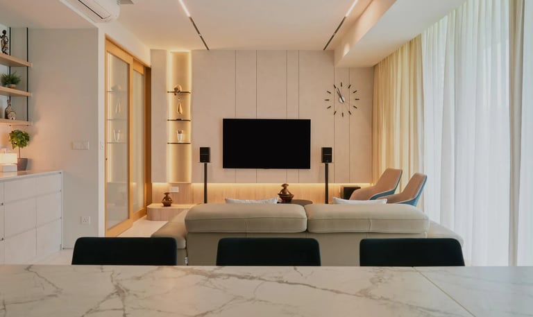 Bespoke feature console with ambient lighting crafted to enhance living rooms, balancing style and practicality with expert woodworking.